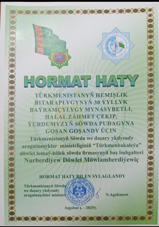16-njy noýabrda Türkmenistanyň Magtymguly adyndaky Ýaşlar guramasynyň Merkezi geňeşiniň döredilen güni mynasybetli zähmetde, döredijilikde aýratyn tapawutlanan ýaşlara Türkmenistanyň Ýaşlar